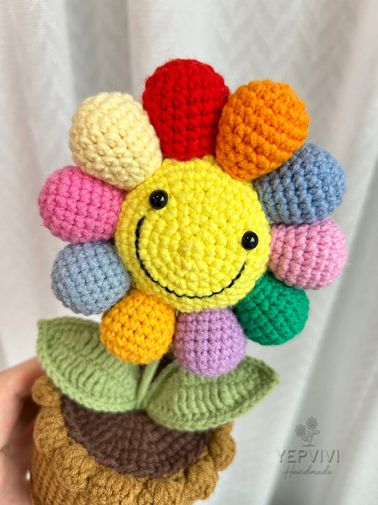 Finished crochet rainbow sunflower with smile face in pot. desk/home decor Unique handmade gift.