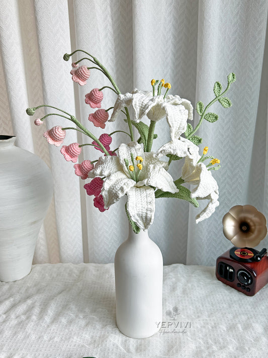 Finished crochet lily bouquet home decor. 3 Lilies, 2 lily of valley, 1 leaf. desk decor. (no vase)