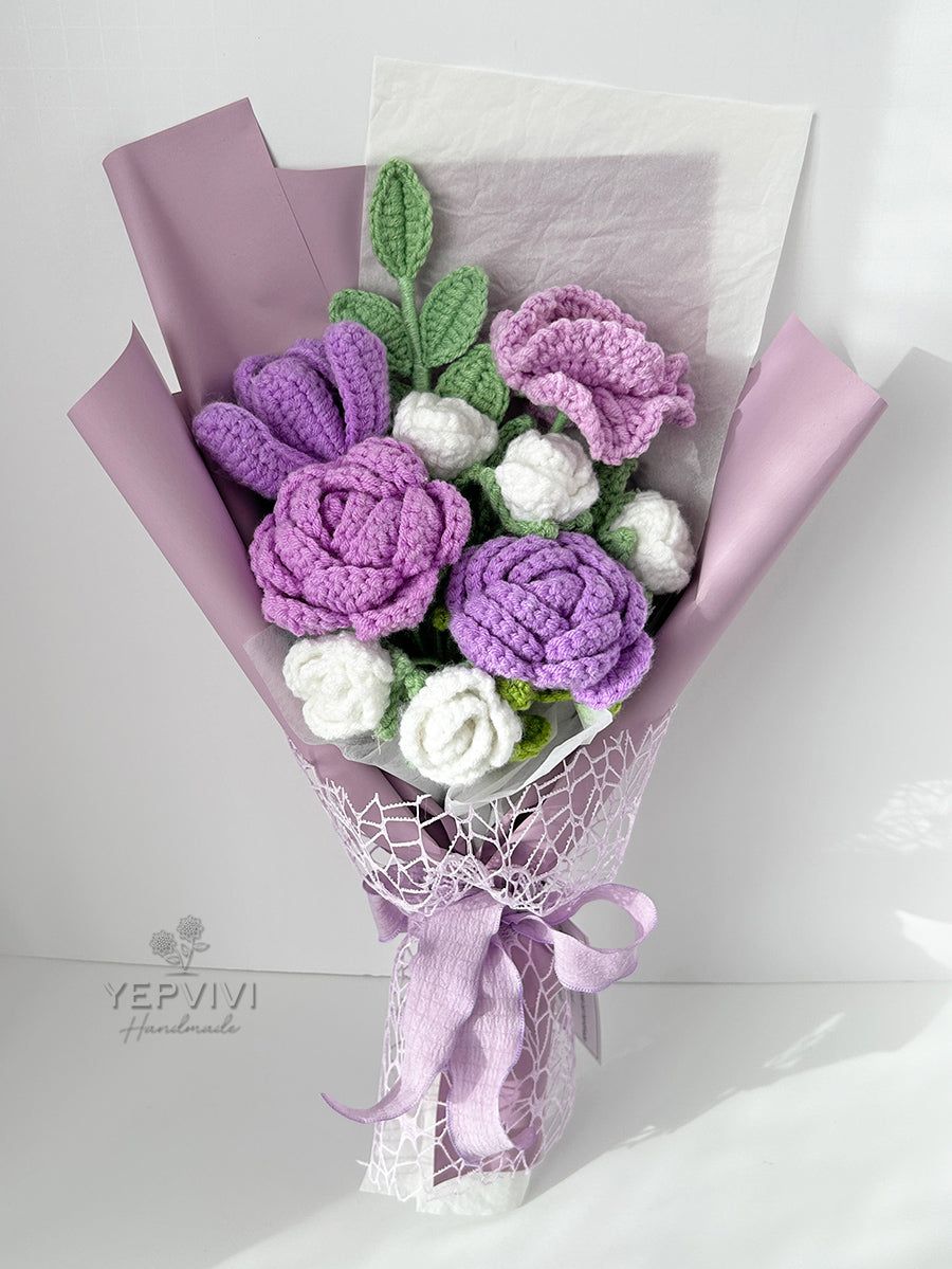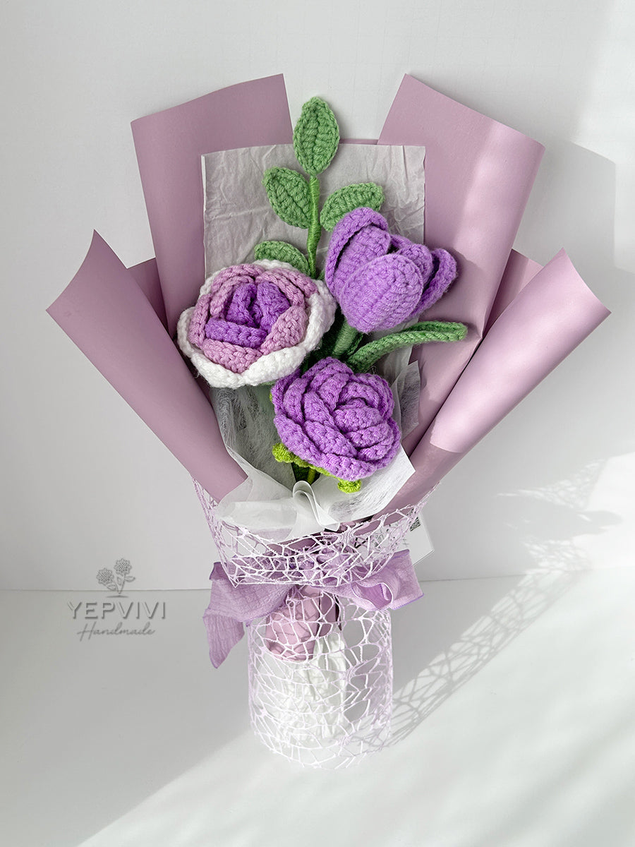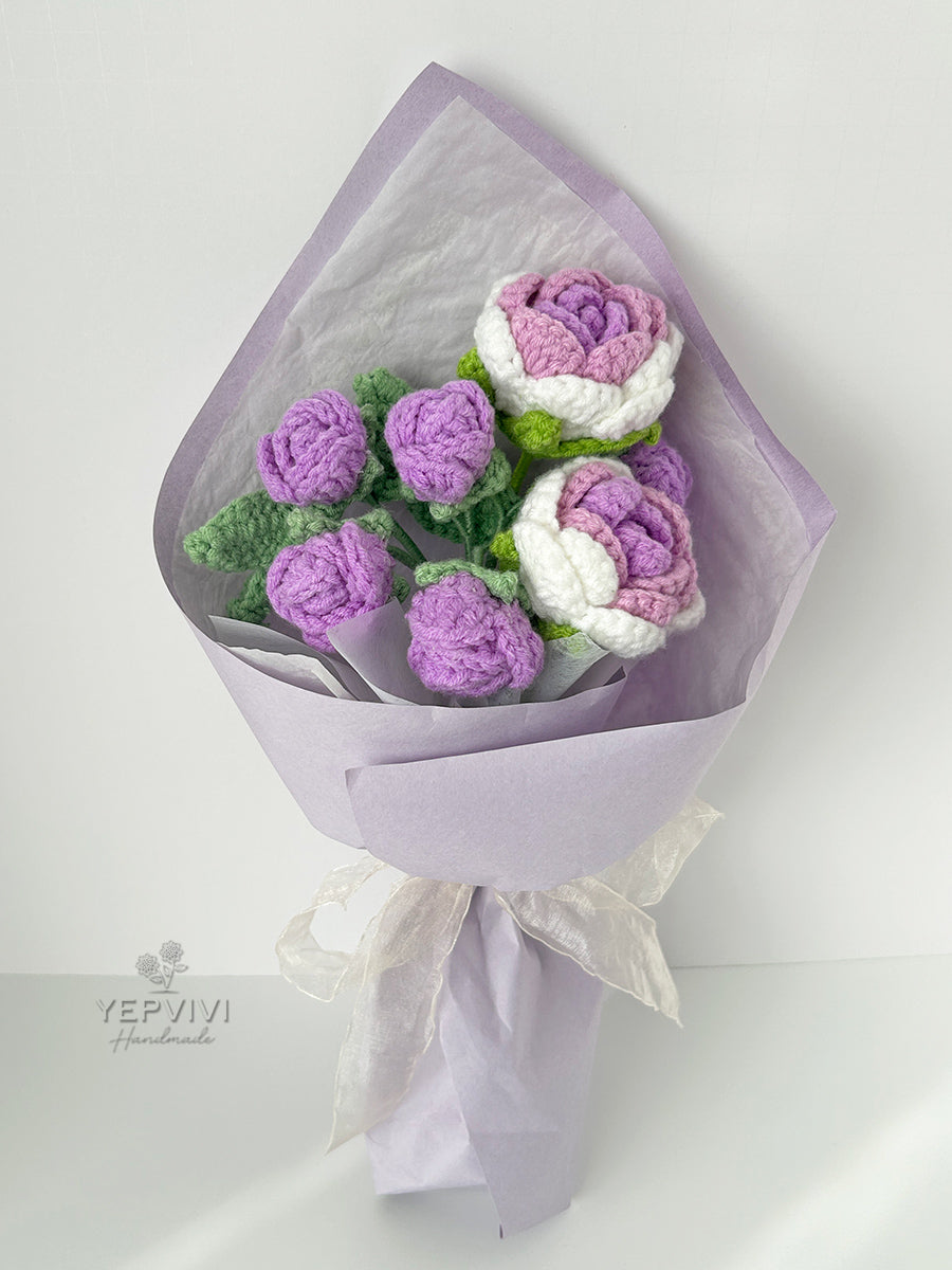 Finished crochet purple rose bouquet. Unique handmade gift for women.