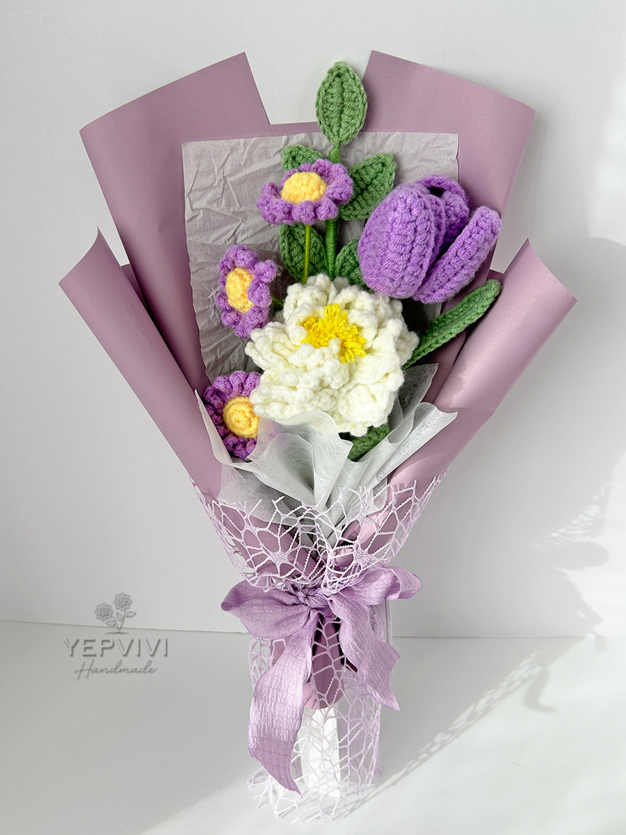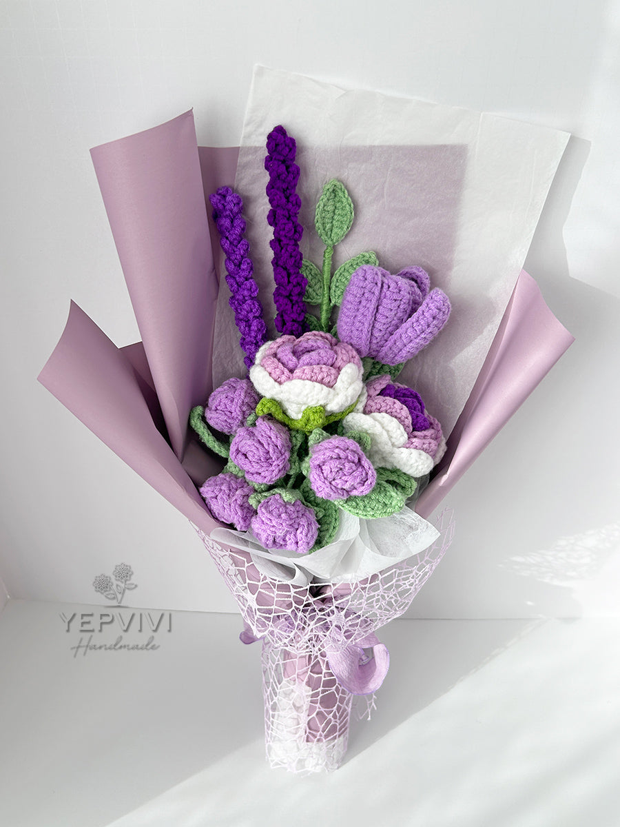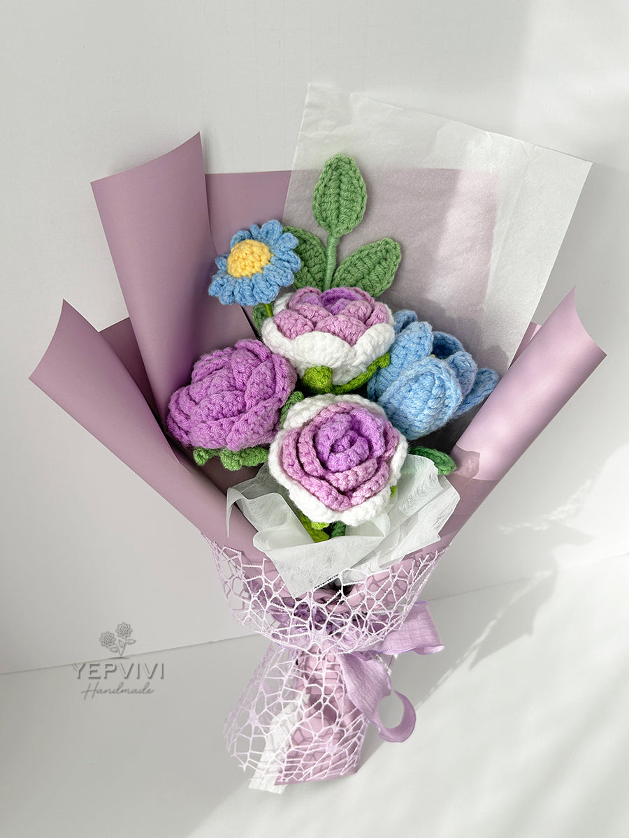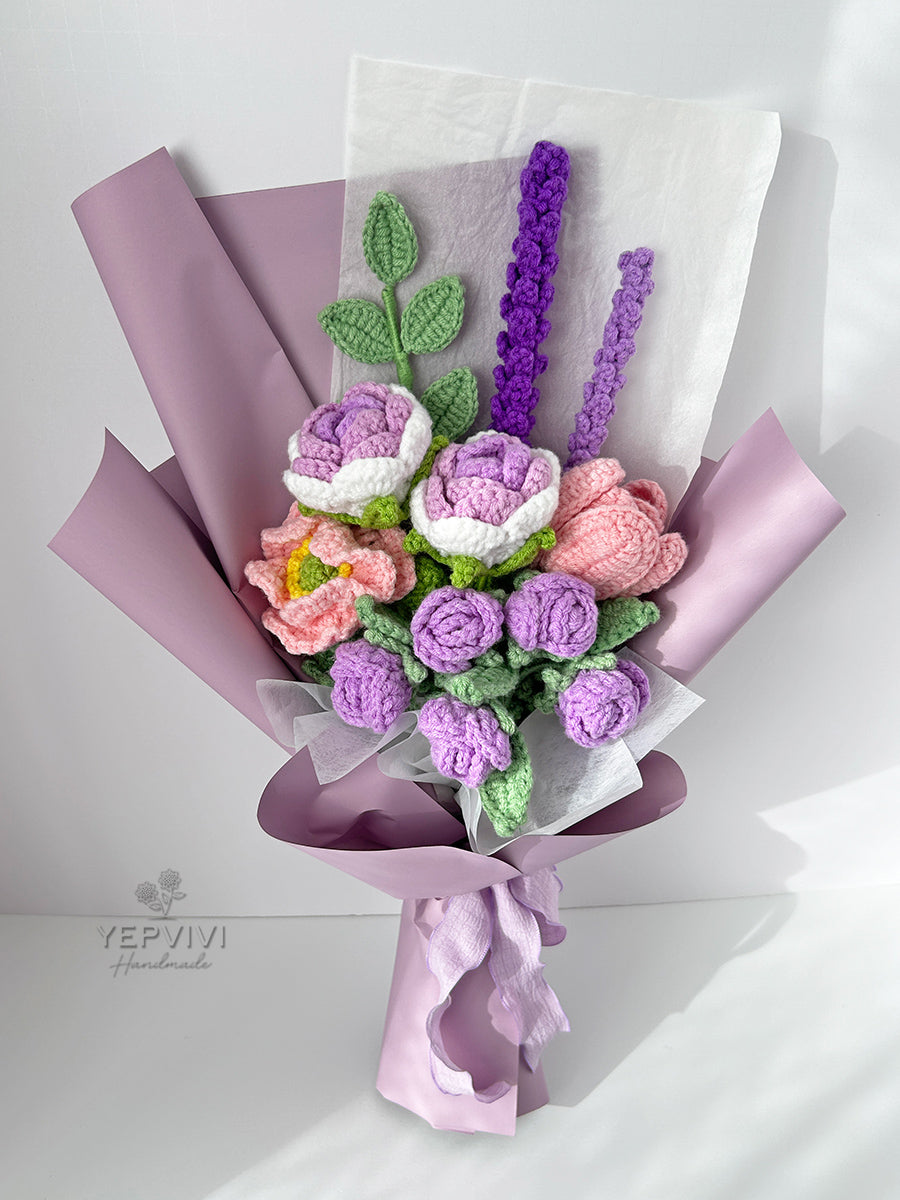Finished crochet purple rose bouquet. Unique handmade gift for women.